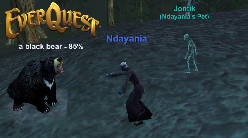 I immediately fell in love with the Necromancer’s summonable skeletons. They have procedurally-generated names! WoW kinda borrowed that concept with Warlock pets, but those are the same everytime they’re summoned. There’s a different sort of bonding that comes with named minions who you will never see again if they get killed. My first skeleton was Jontik, and no lie I would have done anything for that loyal little guy. Except he was a lvl 1 skeleton and he didn’t live very long once I’d reached the properly-leveled monsters for a lvl 25 character. After biting off more than I can chew, I rapidly learned a couple different things about EverQuest: (1) It blessedly lets you swap your equipped items even mid-combat unlike WoW and FF14, and (2) it really stings to die and de-level from where you were. I can see why WoW removed XP loss, but it certainly added a level of investment and care to whatever I did.