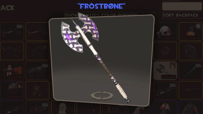 And before we continue, I shamelessly admit this is one of the most minor observations I’ve probably ever made in TF2. It’s not quite on the level of 500 characters on the wind you can only notice during a single taunt, but it would fit comfortably into that list of nitpick articles in the final paragraph. Anyway, after a couple different times visiting my Demoman loadout page, I realized the Skullcutter’s inventory icon was occasionally showcasing the purple sheen. It’d happen maybe 10% of the time I opened the page.