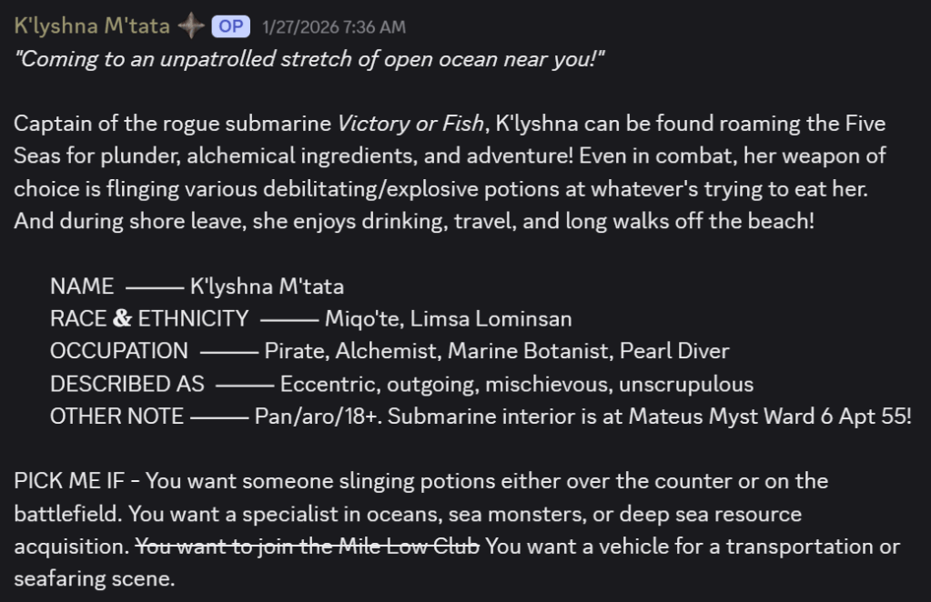 Of course, there was the tiny matter that her submarine was stolen, incriminating her under Eorzean piracy laws, but it was a small price to pay for her newfound freedom. If you’re in the market for plunder, ocean-sourced potions, or swashbuckling adventure, don’t hesitate to seek out Cap’n K’lyshna, the pirate alchemist!