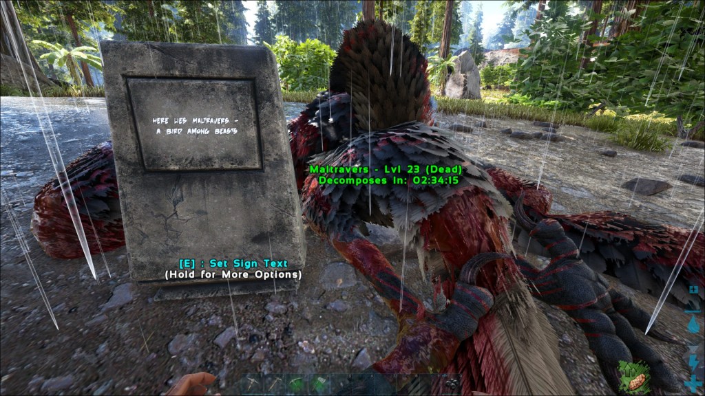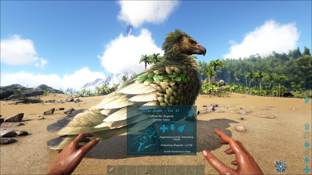 Czar Cider was Asmund’s loyal steed, an argentavis he caught extremely early on and supercharged into a true badass among beasts. Thanks to Asmund’s training, Cider grew to outlevel both of us and could probably take anything on the island by the time the series ended. On several occasions we both died and stranded Cider in hostile territory, and when we returned while fearing the worst, we discovered him surrounded by bodies and still massacring wildlife while fighting fit. All the more impressive considering he wasn’t allowed to die and respawn like we could!