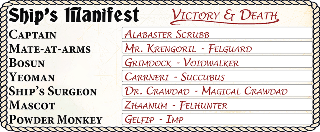 Alabaster, meanwhile, is turned as promised, and overjoyed at having cheated the greatest fear that had plagued his mortal life. Now free to adventure to his heart’s content, he turns to warlock magic for power, rechristens himself “Cap’n Scrubb,” and begins exploring the world as a bombastic and eccentric pirate on his self-built ship Victory and Death, which he carries around in a bottle until he pops the cork to magically transform it to full size. His warlock minions are his ‘loyal crew’, which he somehow never notices are the laziest, least reliable, most treacherous of companions who all regularly attempt to get him killed in the line of duty.