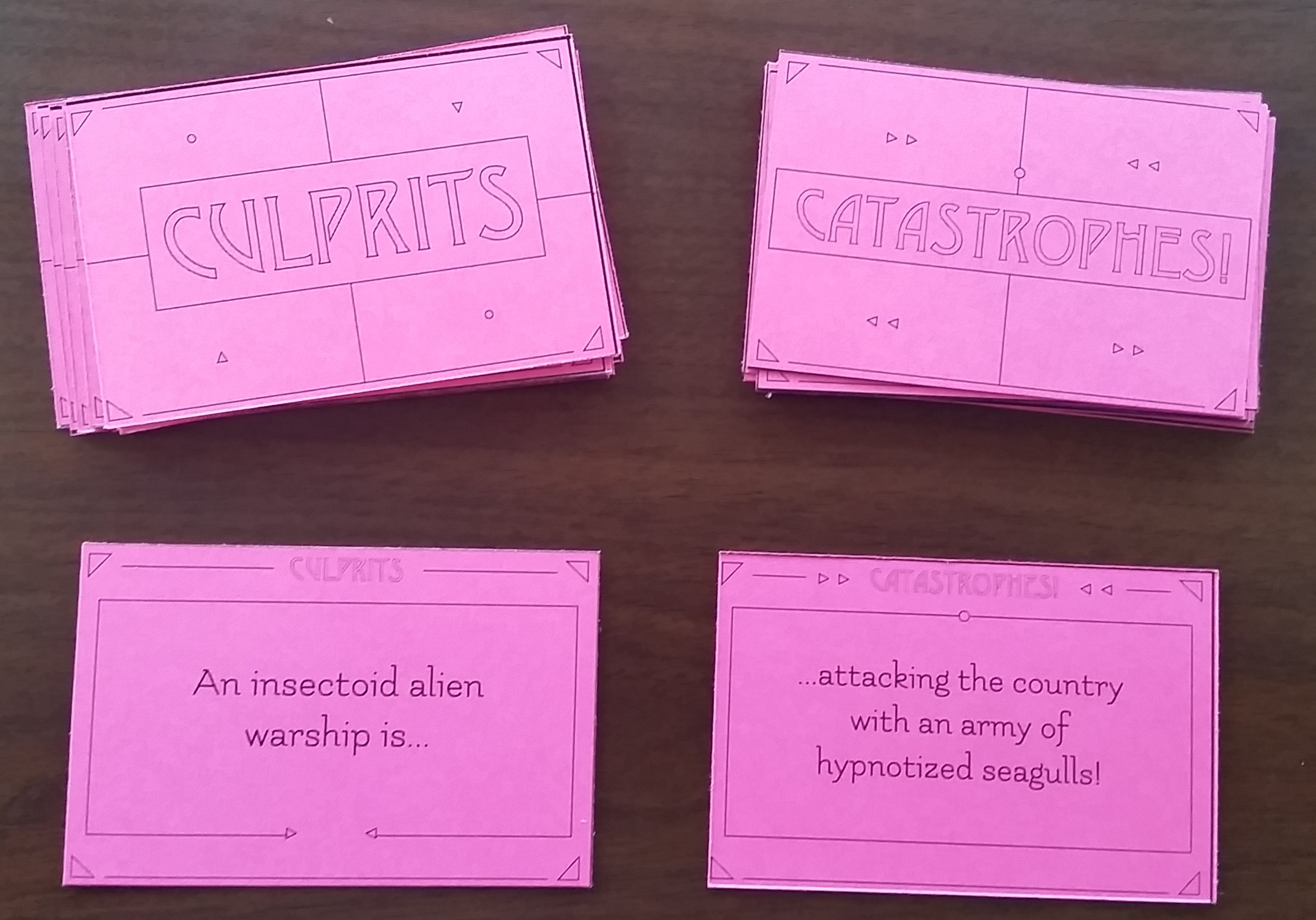 Download the cards here! Includes four decks: Hero, Weapon of Choice, Culprits, Catastrophes; and one ‘President’ card. Set the Dynamic Duos deck aside, it’s for a variant ruleset detailed at the end of this page.